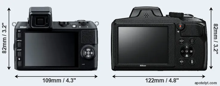 If the front view area (width x height) of the cameras is taken as an aggregate measure of their size, the Nikon B600 is notably larger (12 percent) than the Nikon 1 V2. In this context, it is worth noting that neither the V2 nor the B600 are weather-sealed.