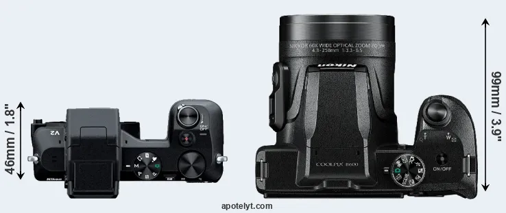 The physical size and weight of the Nikon 1 V2 and the Nikon B600 are illustrated in the side-by-side display below. The two cameras are presented according to their relative size. Three consecutive views from the front, the top, and the rear side are shown. All size dimensions are rounded to the nearest millimeter.