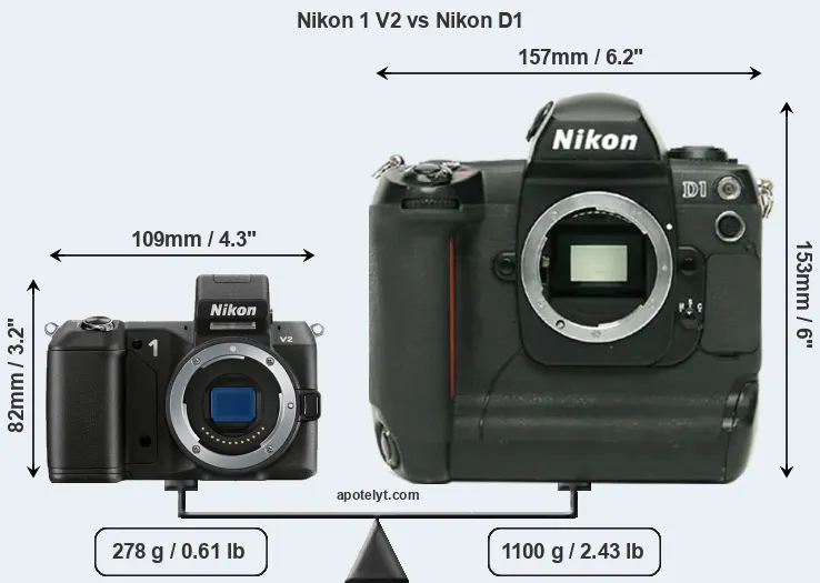 If the front view area (width x height) of the cameras is taken as an aggregate measure of their size, the Nikon D1 is considerably larger (169 percent) than the Nikon 1 V2. Moreover, the D1 is substantially heavier (296 percent) than the V2. It is noteworthy in this context that the D1 is splash and dust-proof, while the V2 does not feature any corresponding weather-sealing.