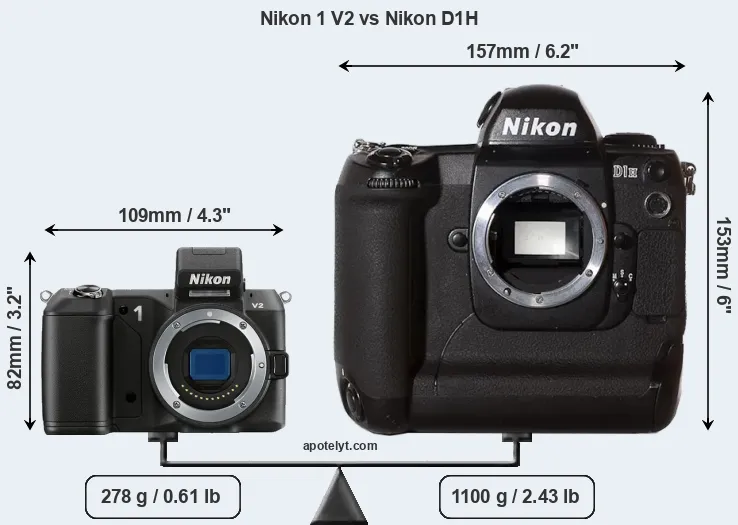 If the front view area (width x height) of the cameras is taken as an aggregate measure of their size, the Nikon D1H is considerably larger (169 percent) than the Nikon 1 V2. Moreover, the D1H is substantially heavier (296 percent) than the V2. It is noteworthy in this context that the D1H is splash and dust-proof, while the V2 does not feature any corresponding weather-sealing.