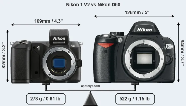 The side-by-side display below illustrates the physical size and weight of the Nikon 1 V2 and the Nikon D60. The two cameras are presented according to their relative size. Three consecutive perspectives from the front, the top, and the back are available. All width, height and depth dimensions are rounded to the nearest millimeter.