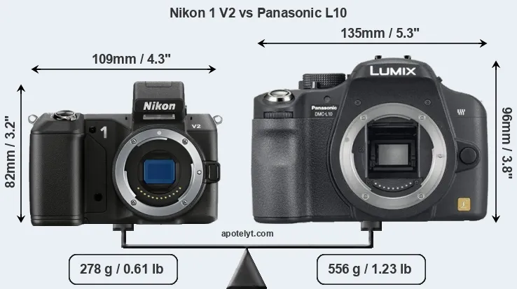 The side-by-side display below illustrates the physical size and weight of the Nikon 1 V2 and the Panasonic L10. The two cameras are presented according to their relative size. Three consecutive perspectives from the front, the top, and the back are available. All width, height and depth dimensions are rounded to the nearest millimeter.