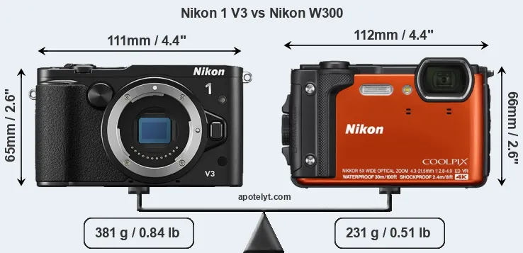 The physical size and weight of the Nikon 1 V3 and the Nikon W300 are illustrated in the side-by-side display below. The two cameras are presented according to their relative size. Three successive views from the front, the top, and the rear are shown. All size dimensions are rounded to the nearest millimeter.