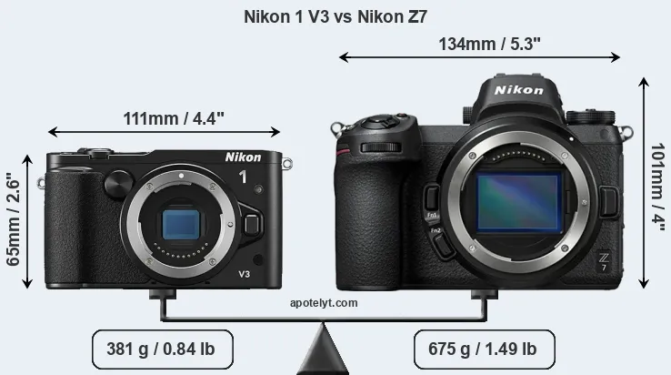 An illustration of the physical size and weight of the Nikon 1 V3 and the Nikon Z7 is provided in the side-by-side display below. The two cameras are presented according to their relative size. Three consecutive perspectives from the front, the top, and the back are available. All width, height and depth dimensions are rounded to the nearest millimeter.