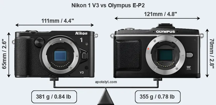 An illustration of the physical size and weight of the Nikon 1 V3 and the Olympus E-P2 is provided in the side-by-side display below. The two cameras are presented according to their relative size. Three successive views from the front, the top, and the rear are shown. All width, height and depth measures are rounded to the nearest millimeter.