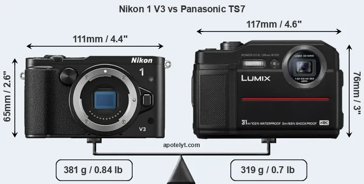 The side-by-side display below illustrates the physical size and weight of the Nikon 1 V3 and the Panasonic TS7. The two cameras are presented according to their relative size. Three consecutive perspectives from the front, the top, and the back are available. All size dimensions are rounded to the nearest millimeter.