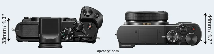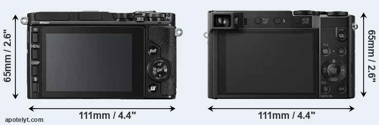 The side-by-side display below illustrates the physical size and weight of the Nikon 1 V3 and the Panasonic ZS100. The two cameras are presented according to their relative size. Three consecutive perspectives from the front, the top, and the back are available. All width, height and depth dimensions are rounded to the nearest millimeter.