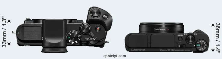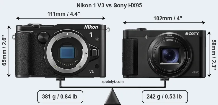 The side-by-side display below illustrates the physical size and weight of the Nikon 1 V3 and the Sony HX95. The two cameras are presented according to their relative size. Three consecutive perspectives from the front, the top, and the back are available. All width, height and depth dimensions are rounded to the nearest millimeter.