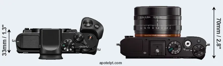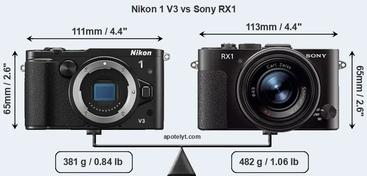 An illustration of the physical size and weight of the Nikon 1 V3 and the Sony RX1 is provided in the side-by-side display below. The two cameras are presented according to their relative size. Three consecutive views from the front, the top, and the rear side are shown. All width, height and depth measures are rounded to the nearest millimeter.