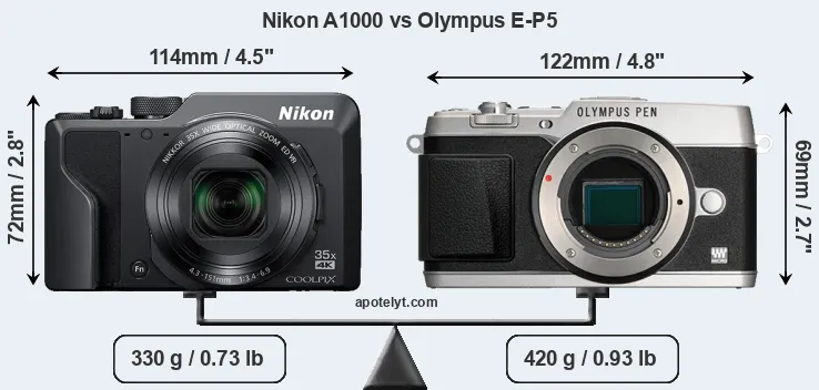 The side-by-side display below illustrates the physical size and weight of the Nikon A1000 and the Olympus E-P5. The two cameras are presented according to their relative size. Three consecutive views from the front, the top, and the rear side are shown. All width, height and depth dimensions are rounded to the nearest millimeter.