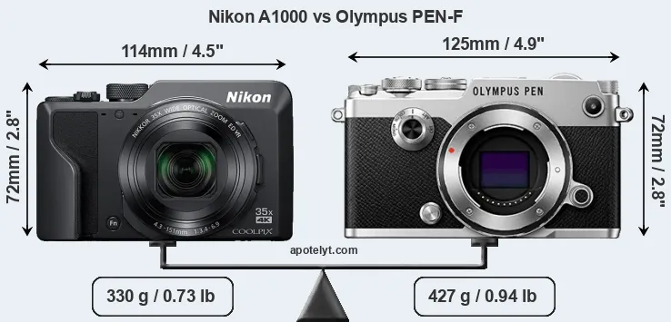 If the front view area (width x height) of the cameras is taken as an aggregate measure of their size, the Olympus PEN-F is notably larger (10 percent) than the Nikon A1000. In this context, it is worth noting that neither the A1000 nor the PEN-F are weather-sealed.