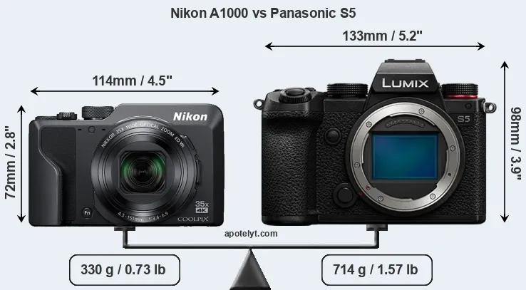 If the front view area (width x height) of the cameras is taken as an aggregate measure of their size, the Panasonic S5 is considerably larger (59 percent) than the Nikon A1000. It is noteworthy in this context that the S5 is splash and dust-proof, while the A1000 does not feature any corresponding weather-sealing.
