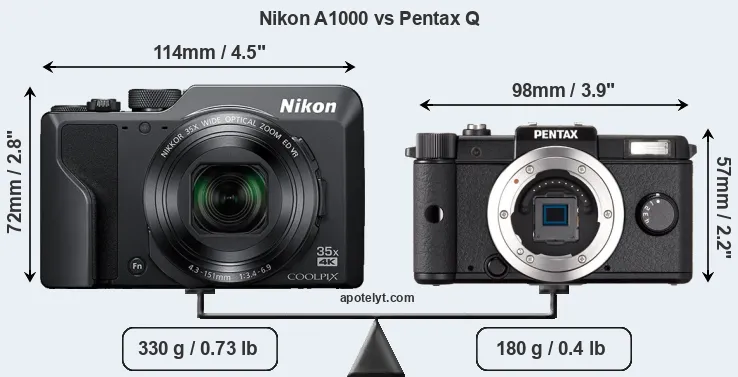 The side-by-side display below illustrates the physical size and weight of the Nikon A1000 and the Pentax Q. The two cameras are presented according to their relative size. Three successive views from the front, the top, and the rear are shown. All size dimensions are rounded to the nearest millimeter.