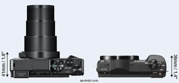 An illustration of the physical size and weight of the Nikon A1000 and the Sony A5100 is provided in the side-by-side display below. The two cameras are presented according to their relative size. Three consecutive perspectives from the front, the top, and the back are available. All width, height and depth dimensions are rounded to the nearest millimeter.