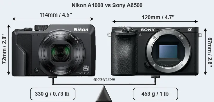 The physical size and weight of the Nikon A1000 and the Sony A6500 are illustrated in the side-by-side display below. The two cameras are presented according to their relative size. Three consecutive perspectives from the front, the top, and the back are available. All size dimensions are rounded to the nearest millimeter.