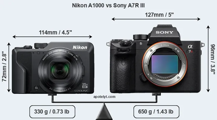 The Nikon Coolpix A1000 and the Sony Alpha A7R III are two digital cameras that were revealed to the public, respectively, in January 2019 and October 2017. The A1000 is a fixed lens compact, while the A7R III is a mirrorless interchangeable lens camera. The cameras are based on a 1/2.3-inch (A1000) and a full frame (A7R III) sensor. The Nikon has a resolution of 15.9 megapixels, whereas the Sony provides 42.2 MP.