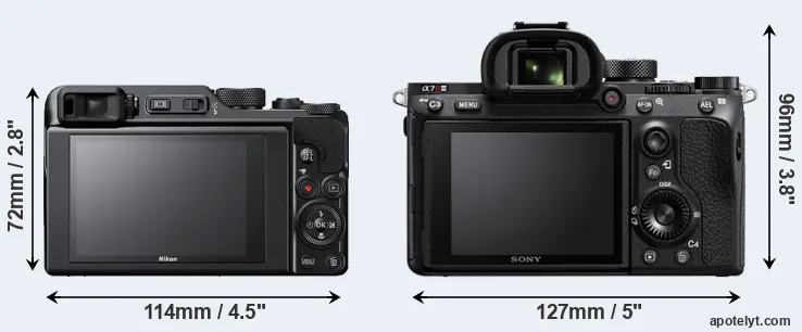 If the front view area (width x height) of the cameras is taken as an aggregate measure of their size, the Sony A7R III is considerably larger (49 percent) than the Nikon A1000. It is noteworthy in this context that the A7R III is splash and dust-proof, while the A1000 does not feature any corresponding weather-sealing.