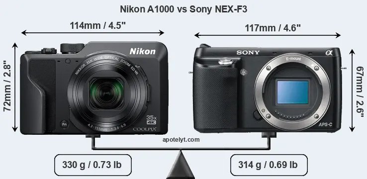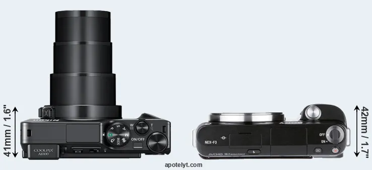The physical size and weight of the Nikon A1000 and the Sony NEX-F3 are illustrated in the side-by-side display below. The two cameras are presented according to their relative size. Three consecutive views from the front, the top, and the rear side are shown. All width, height and depth measures are rounded to the nearest millimeter.