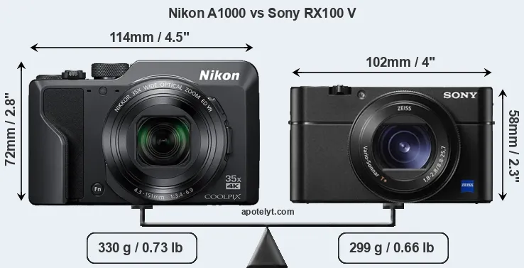 An illustration of the physical size and weight of the Nikon A1000 and the Sony RX100 V is provided in the side-by-side display below. The two cameras are presented according to their relative size. Three successive views from the front, the top, and the rear are shown. All size dimensions are rounded to the nearest millimeter.