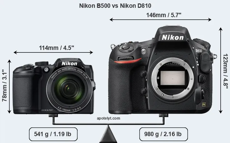 An illustration of the physical size and weight of the Nikon B500 and the Nikon D810 is provided in the side-by-side display below. The two cameras are presented according to their relative size. Three consecutive views from the front, the top, and the rear side are shown. All width, height and depth measures are rounded to the nearest millimeter.