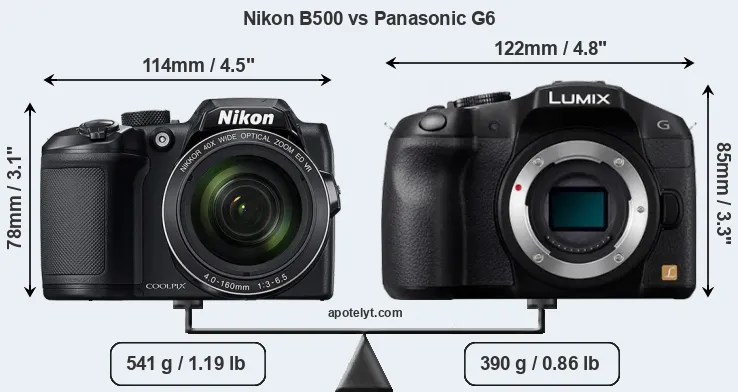 An illustration of the physical size and weight of the Nikon B500 and the Panasonic G6 is provided in the side-by-side display below. The two cameras are presented according to their relative size. Three consecutive perspectives from the front, the top, and the back are available. All size dimensions are rounded to the nearest millimeter.