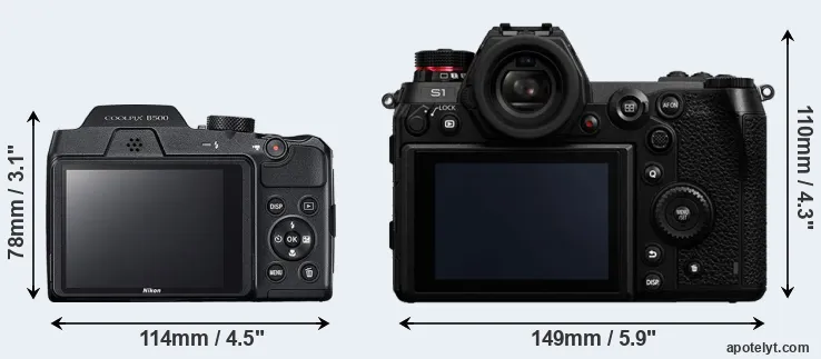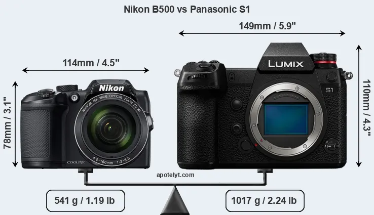 The physical size and weight of the Nikon B500 and the Panasonic S1 are illustrated in the side-by-side display below. The two cameras are presented according to their relative size. Three successive views from the front, the top, and the rear are shown. All size dimensions are rounded to the nearest millimeter.