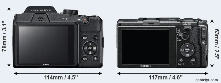The physical size and weight of the Nikon B500 and the Ricoh GR II are illustrated in the side-by-side display below. The two cameras are presented according to their relative size. Three successive views from the front, the top, and the rear are shown. All width, height and depth dimensions are rounded to the nearest millimeter.