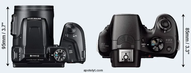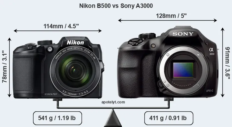 The physical size and weight of the Nikon B500 and the Sony A3000 are illustrated in the side-by-side display below. The two cameras are presented according to their relative size. Three successive views from the front, the top, and the rear are shown. All width, height and depth measures are rounded to the nearest millimeter.