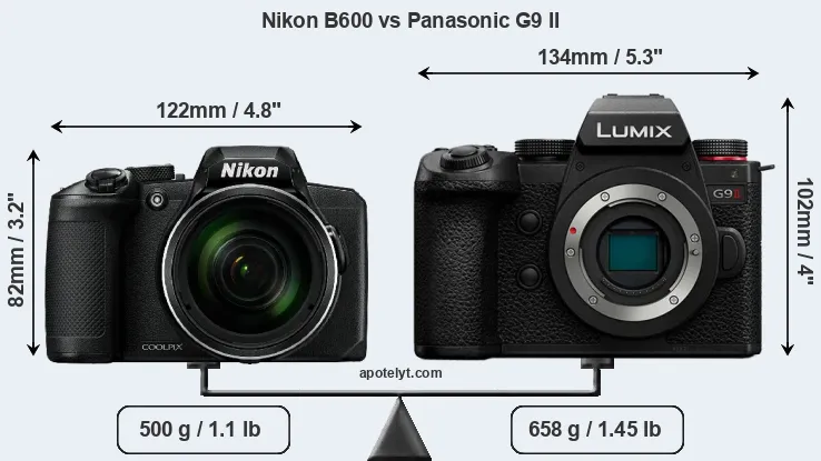 If the front view area (width x height) of the cameras is taken as an aggregate measure of their size, the Panasonic G9 II is notably larger (37 percent) than the Nikon B600. It is noteworthy in this context that the G9 II is splash and dust-proof, while the B600 does not feature any corresponding weather-sealing.