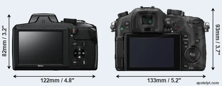 The physical size and weight of the Nikon B600 and the Panasonic GH3 are illustrated in the side-by-side display below. The two cameras are presented according to their relative size. Three successive views from the front, the top, and the rear are shown. All width, height and depth dimensions are rounded to the nearest millimeter.