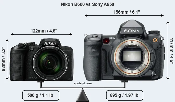 An illustration of the physical size and weight of the Nikon B600 and the Sony A850 is provided in the side-by-side display below. The two cameras are presented according to their relative size. Three consecutive views from the front, the top, and the rear side are shown. All size dimensions are rounded to the nearest millimeter.
