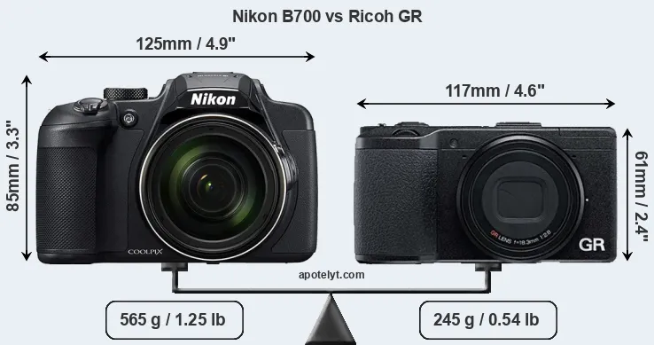 If the front view area (width x height) of the cameras is taken as an aggregate measure of their size, the Ricoh GR is considerably smaller (33 percent) than the Nikon B700. Moreover, the GR is substantially lighter (57 percent) than the B700. In this context, it is worth noting that neither the B700 nor the GR are weather-sealed.