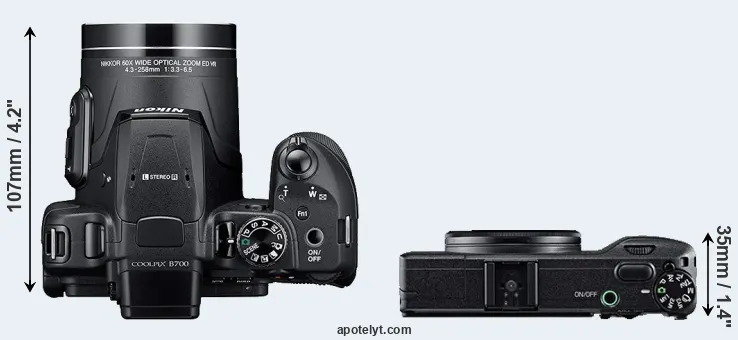 The physical size and weight of the Nikon B700 and the Ricoh GR are illustrated in the side-by-side display below. The two cameras are presented according to their relative size. Three consecutive views from the front, the top, and the rear side are shown. All width, height and depth dimensions are rounded to the nearest millimeter.