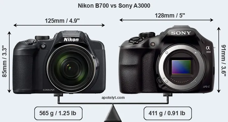 An illustration of the physical size and weight of the Nikon B700 and the Sony A3000 is provided in the side-by-side display below. The two cameras are presented according to their relative size. Three successive views from the front, the top, and the rear are shown. All width, height and depth dimensions are rounded to the nearest millimeter.