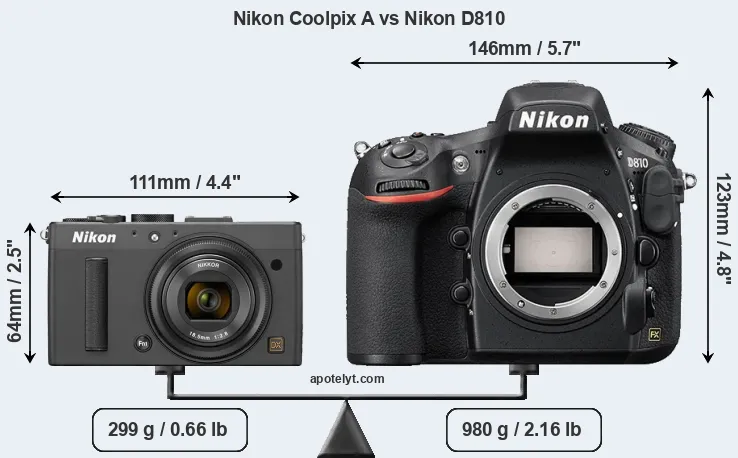 An illustration of the physical size and weight of the Nikon Coolpix A and the Nikon D810 is provided in the side-by-side display below. The two cameras are presented according to their relative size. Three consecutive views from the front, the top, and the rear side are shown. All width, height and depth measures are rounded to the nearest millimeter.