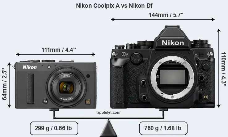If the front view area (width x height) of the cameras is taken as an aggregate measure of their size, the Nikon Df is considerably larger (123 percent) than the Nikon Coolpix A. It is noteworthy in this context that the Df is splash and dust-proof, while the Coolpix A does not feature any corresponding weather-sealing.