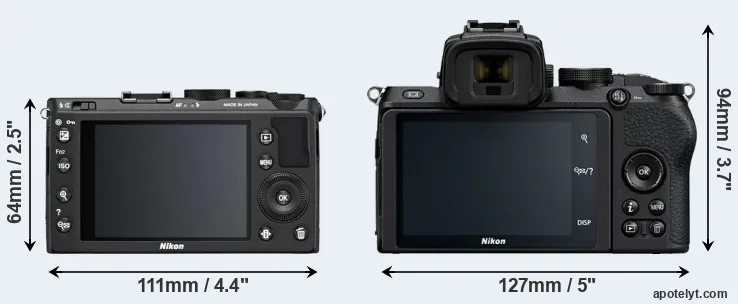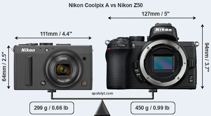 The physical size and weight of the Nikon Coolpix A and the Nikon Z50 are illustrated in the side-by-side display below. The two cameras are presented according to their relative size. Three consecutive perspectives from the front, the top, and the back are available. All width, height and depth dimensions are rounded to the nearest millimeter.