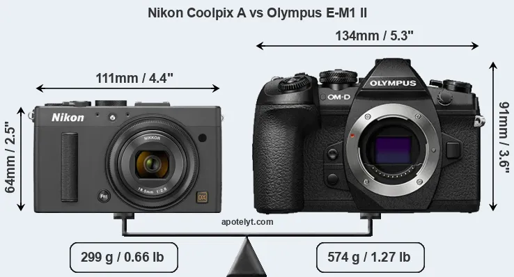 If the front view area (width x height) of the cameras is taken as an aggregate measure of their size, the Olympus E-M1 II is considerably larger (72 percent) than the Nikon Coolpix A. It is noteworthy in this context that the E-M1 II is splash and dust-proof, while the Coolpix A does not feature any corresponding weather-sealing.