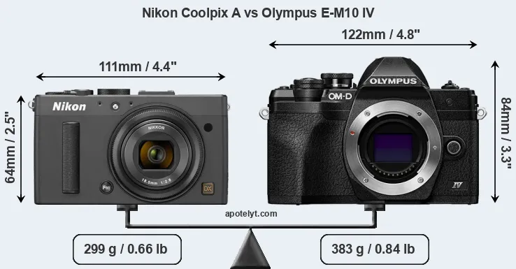 An illustration of the physical size and weight of the Nikon Coolpix A and the Olympus E-M10 IV is provided in the side-by-side display below. The two cameras are presented according to their relative size. Three successive views from the front, the top, and the rear are shown. All size dimensions are rounded to the nearest millimeter.