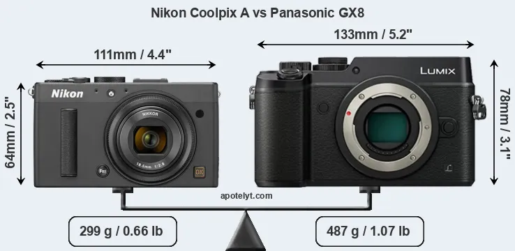 If the front view area (width x height) of the cameras is taken as an aggregate measure of their size, the Panasonic GX8 is considerably larger (46 percent) than the Nikon Coolpix A. It is noteworthy in this context that the GX8 is splash and dust-proof, while the Coolpix A does not feature any corresponding weather-sealing.