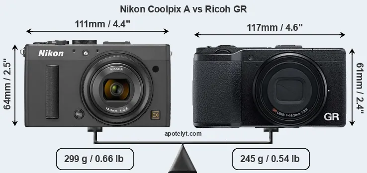 If the front view area (width x height) of the cameras is taken as an aggregate measure of their size, the Nikon Coolpix A and the Ricoh GR are of equal size. However, the GR is markedly lighter (18 percent) than the Coolpix A. In this context, it is worth noting that neither the Coolpix A nor the GR are weather-sealed.