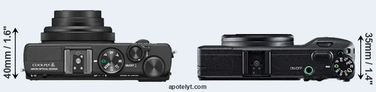 The physical size and weight of the Nikon Coolpix A and the Ricoh GR are illustrated in the side-by-side display below. The two cameras are presented according to their relative size. Three consecutive perspectives from the front, the top, and the back are available. All width, height and depth dimensions are rounded to the nearest millimeter.