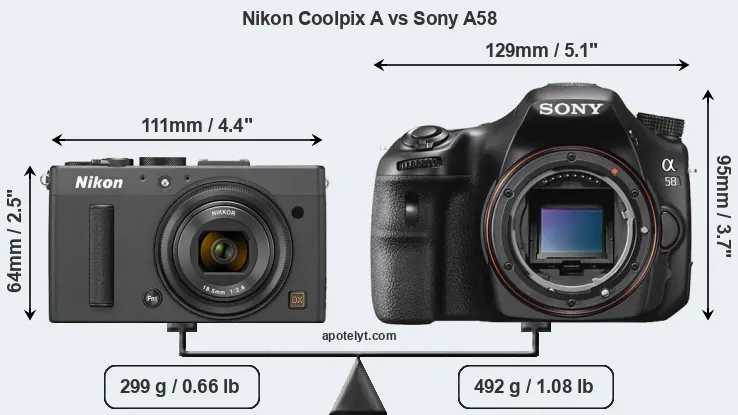 An illustration of the physical size and weight of the Nikon Coolpix A and the Sony A58 is provided in the side-by-side display below. The two cameras are presented according to their relative size. Three successive views from the front, the top, and the rear are shown. All size dimensions are rounded to the nearest millimeter.