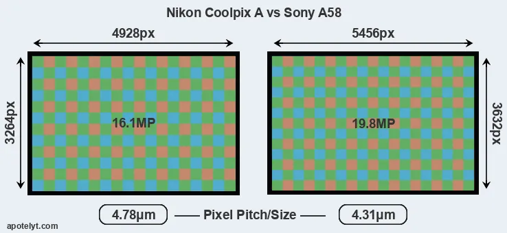 Despite having a slightly smaller sensor, the A58 offers a higher resolution of 19.8 megapixels, compared with 16.1 MP of the Coolpix A. This megapixels advantage comes at the cost of a higher pixel density and a smaller size of the individual pixel (with a pixel pitch of 4.31μm versus 4.78μm for the Coolpix A). It is noteworthy in this context that the two cameras were released in close succession, so that their sensors are from the same technological generation. Coming back to sensor resolution, it should be mentioned that the Coolpix A has no anti-alias filter installed, so that it can capture all the detail its sensor resolves.