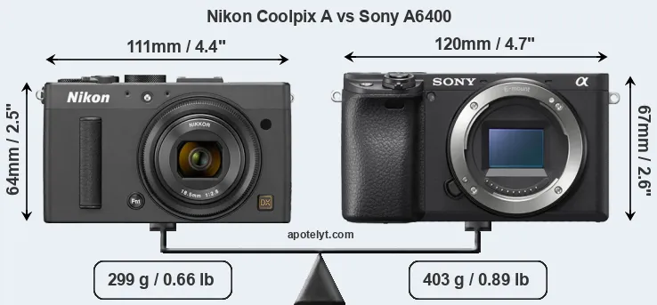 An illustration of the physical size and weight of the Nikon Coolpix A and the Sony A6400 is provided in the side-by-side display below. The two cameras are presented according to their relative size. Three consecutive views from the front, the top, and the rear side are shown. All width, height and depth measures are rounded to the nearest millimeter.