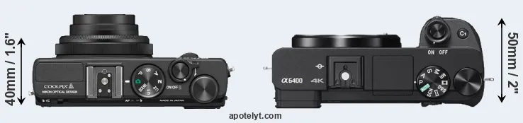 If the front view area (width x height) of the cameras is taken as an aggregate measure of their size, the Sony A6400 is notably larger (13 percent) than the Nikon Coolpix A. It is noteworthy in this context that the A6400 is splash and dust-proof, while the Coolpix A does not feature any corresponding weather-sealing.