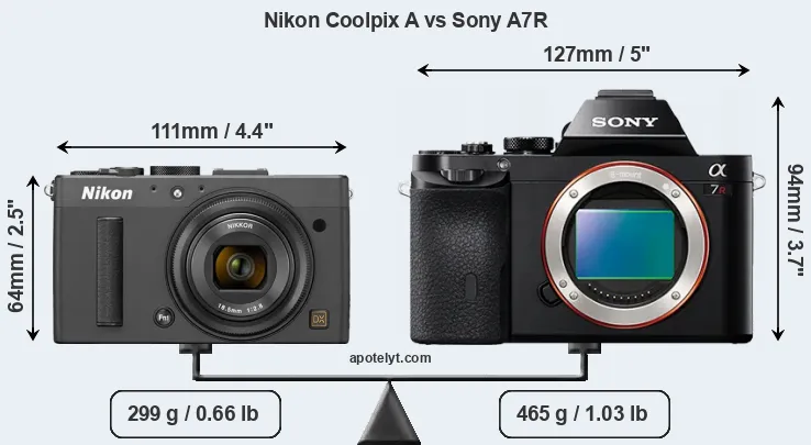If the front view area (width x height) of the cameras is taken as an aggregate measure of their size, the Sony A7R is considerably larger (68 percent) than the Nikon Coolpix A. It is noteworthy in this context that the A7R is splash and dust-proof, while the Coolpix A does not feature any corresponding weather-sealing.