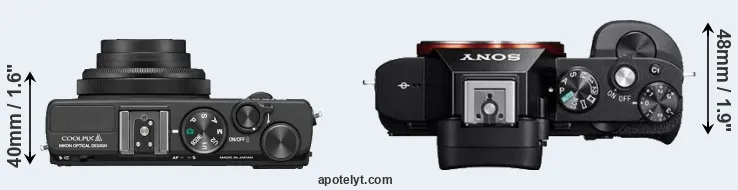 The side-by-side display below illustrates the physical size and weight of the Nikon Coolpix A and the Sony A7R. The two cameras are presented according to their relative size. Three consecutive views from the front, the top, and the rear side are shown. All width, height and depth dimensions are rounded to the nearest millimeter.
