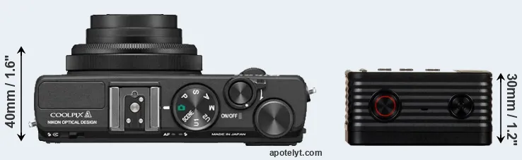 An illustration of the physical size and weight of the Nikon Coolpix A and the Sony RX0 is provided in the side-by-side display below. The two cameras are presented according to their relative size. Three consecutive views from the front, the top, and the rear side are shown. All size dimensions are rounded to the nearest millimeter.