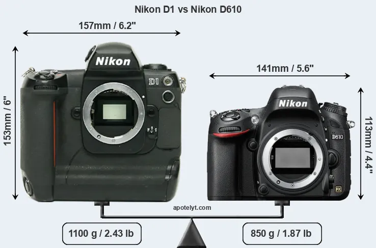 The physical size and weight of the Nikon D1 and the Nikon D610 are illustrated in the side-by-side display below. The two cameras are presented according to their relative size. Three consecutive views from the front, the top, and the rear side are shown. All width, height and depth dimensions are rounded to the nearest millimeter.